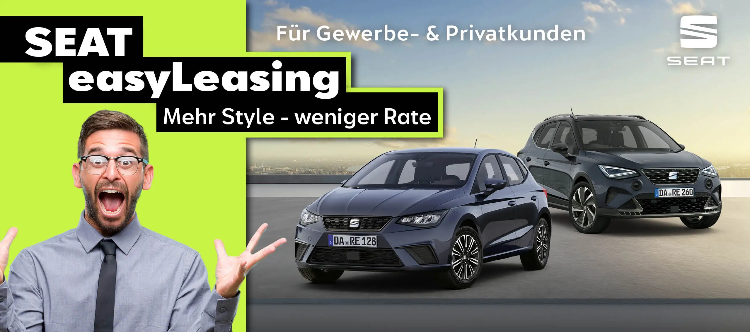 ¹ Ein PrivatLeasing-Angebot der SEAT Leasing, Zweigniederlassung der Volkswagen Leasing GmbH, Gifhorner Straße 57, 38112 Braunschweig, für Privatkunden und Leasingverträge mit 48 Monaten Laufzeit. Bonität vorausgesetzt. Dieses Angebot ist nicht kombinierbar mit anderen Sonderaktionen. Zzgl. Überführungs- und Zulassungskosten.